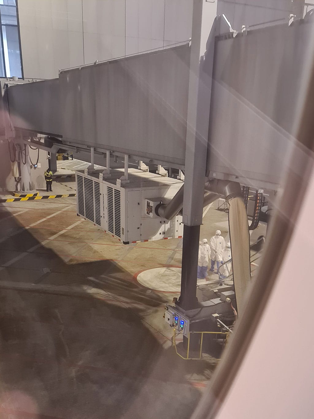 Tout a plutôt bien commencé. Arrivé avec 20 minutes d’avance sur l’horaire à la porte de de débarquement, nous n’avons eu que 20 minutes d’attente dans l’avion avant que 5 cosmonautes arrivent en voiture en dessous de la passerelle de débarquement et qu’ils montent l’escalier pour entrer dans l’avion.