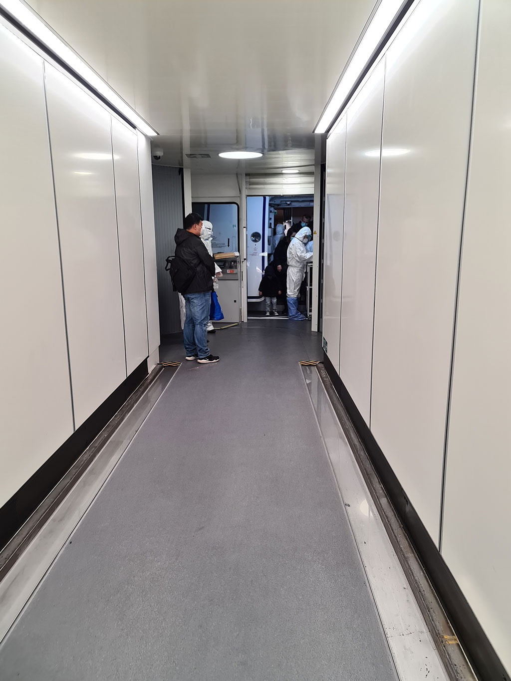 De là le personnel de bord nous appelle un par un par nos noms (pour les chinois) ou en venant nous chercher (pour les étrangers) afin qu’on nous prenne la température (on nous l’a déjà prise 3 fois pendant le vol). Dehors on vérifie nos passeports et on nous demande si ça fait bien plus de 14j qu’on est hors d’une zone à risque.