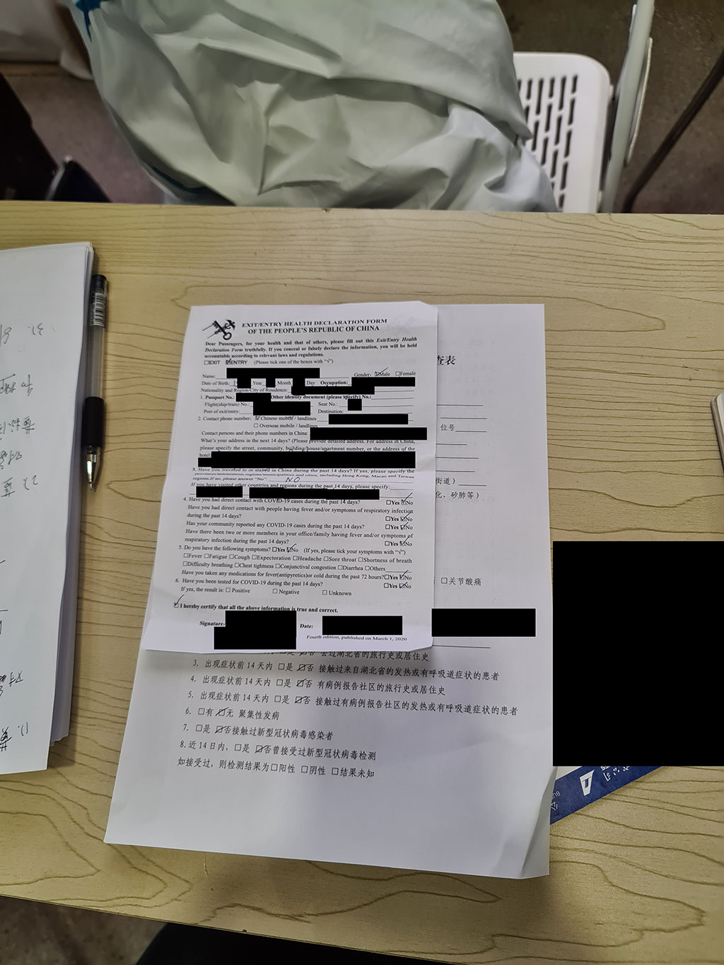 Une femme regarde mon formulaire de déclaration d’état de santé et me repose les questions en Chinois + des questions complémentaires. Elle a un traducteur vocal mais finalement on a fait le tout en chinois car son traducteur buggait 🙂