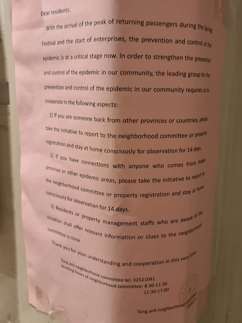 D’après le papier dans la résidence on est censé être en quarantaine dès lors que n’a pas passé les 14 derniers jours sur Shanghai, venant d’une autre province ou de l’étranger.