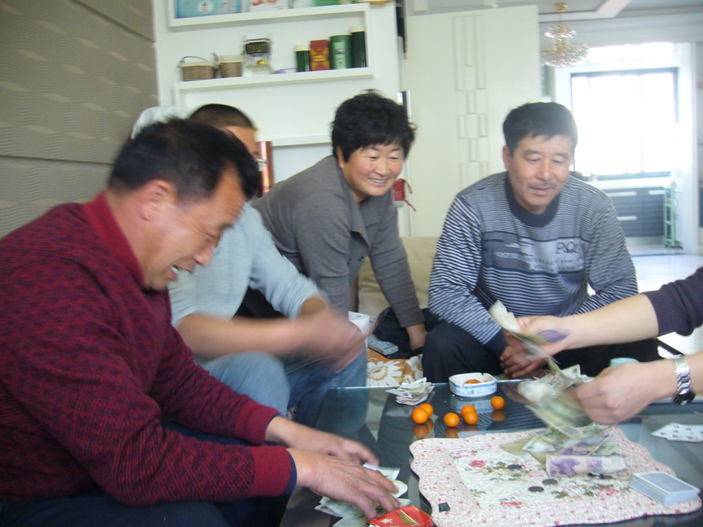 Le diner commença vers 18h00, le père tout fier sorti une bouteille de vin rouge (du Merlot Great Wall) plutôt bon d’ailleurs. Puis ce fut l’heure de regarder CCTV1 et le show habituel du nouvel an. Cette année les chanteurs chantaient sans playback (obligatoire depuis le fiasco de l’année dernière) mais tout le monde trouvait que c’était plutôt ennuyeux et que ca manquait d’originalité cette année. Moi j’étais plutôt fatigué (on s’était levé à 05h00am pour prendre l’avion de 7h50) mais il fallait tenir… et pour garder l’esprit éveillé on commença une partie de poker chinois à 3 cartes dont il ne fallu pas longtemps pour comprendre les règles. La mise était de 1 RMB et c’était plutôt drôle.