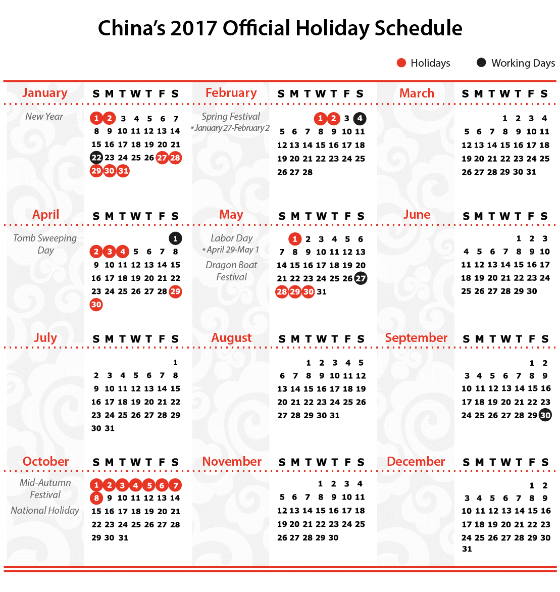 Le gouvernement chinois a annoncé le 1er Décembre les jours fériés en Chine pour 2017 (Vacances officielles Chinoises) :