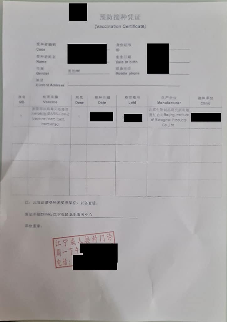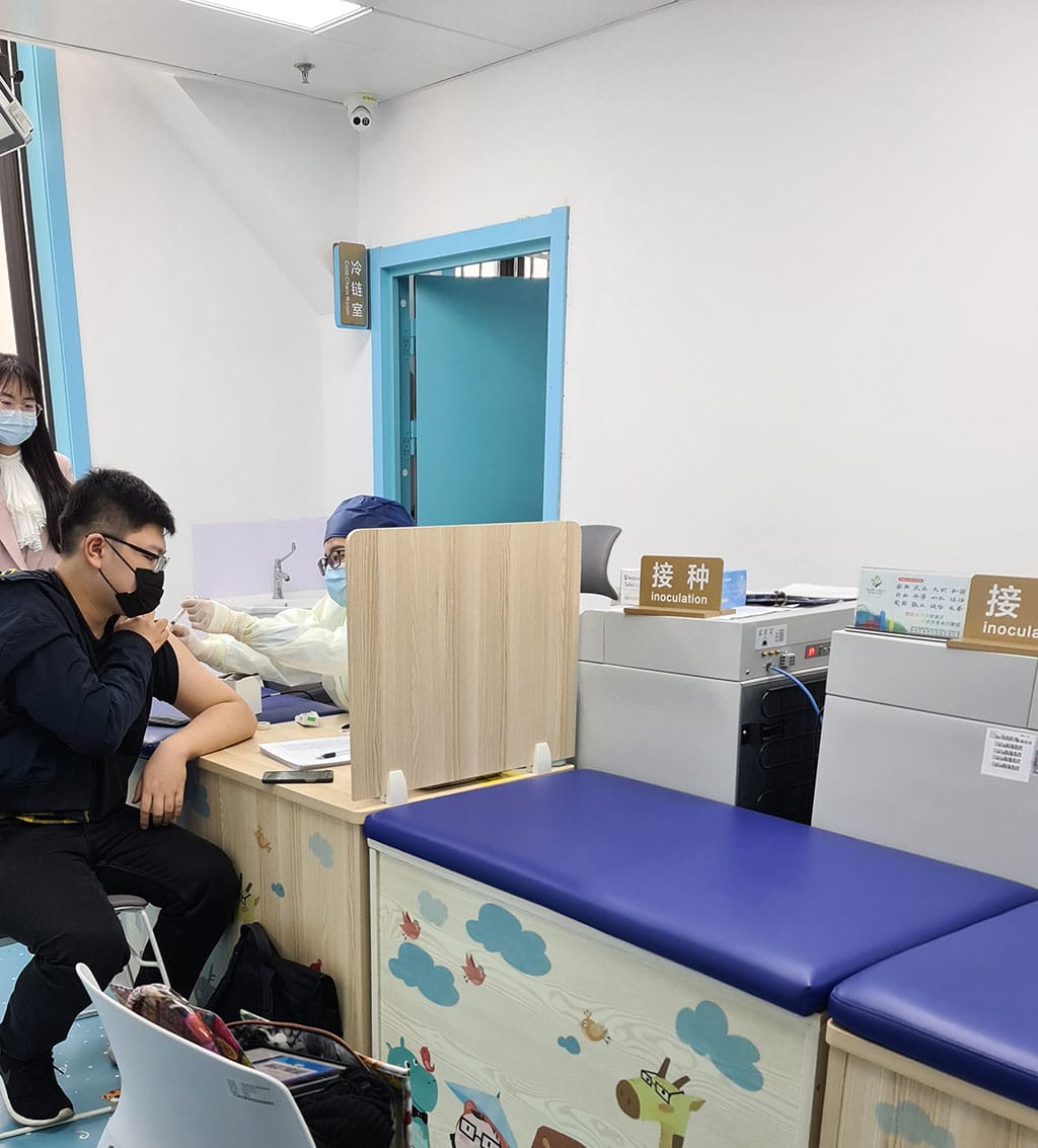 Il faut ensuite attendre 30 minutes pour valider que vous ne faites pas de réaction et demander à l’accueil un certificat de vaccination attestant qu’on a eu la première dose. Il faudra le présenter lors de l’injection de la deuxième dose de vaccin 21 jours plus tard. La deuxième dose sera payante comme la première (100 RMB la dose si pas de sécu chinoise).
