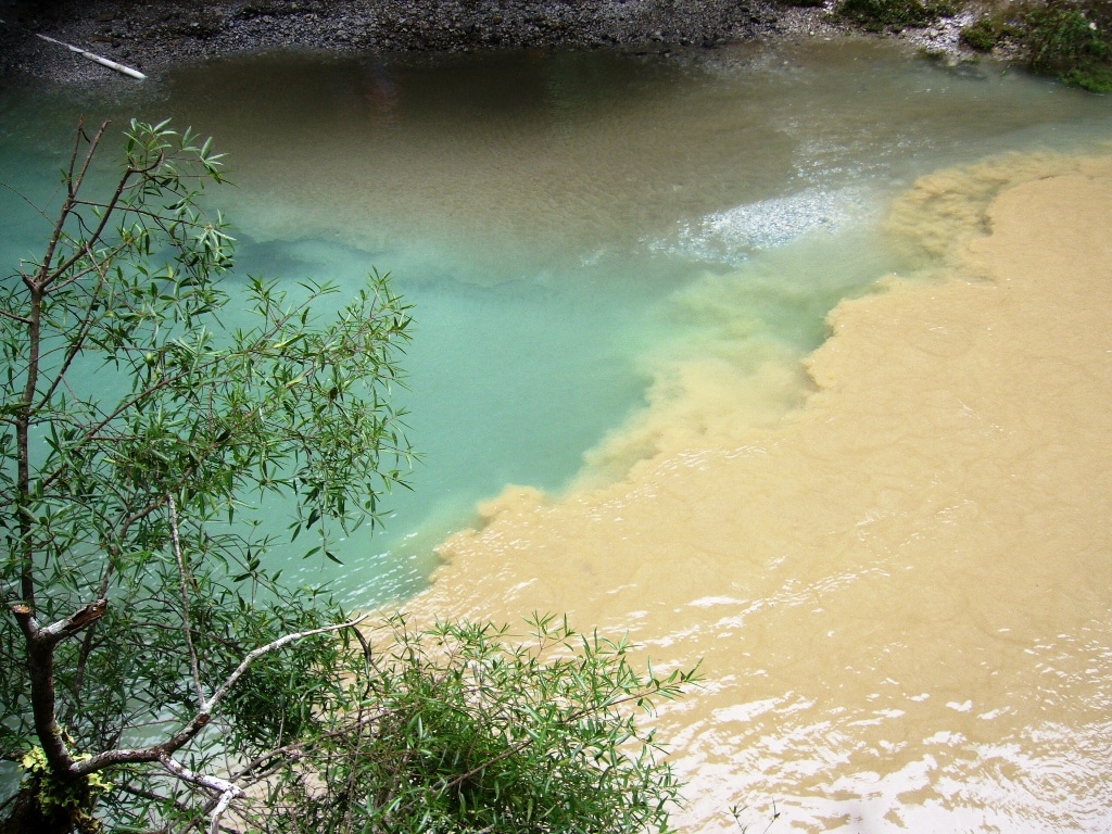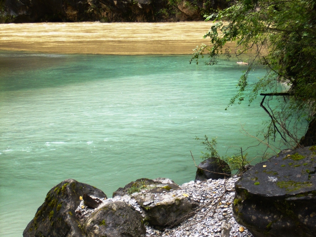 Par moment on voit des ruisseaux et leur eau verte/bleu rejoindre la rivière noircie par les pluies.