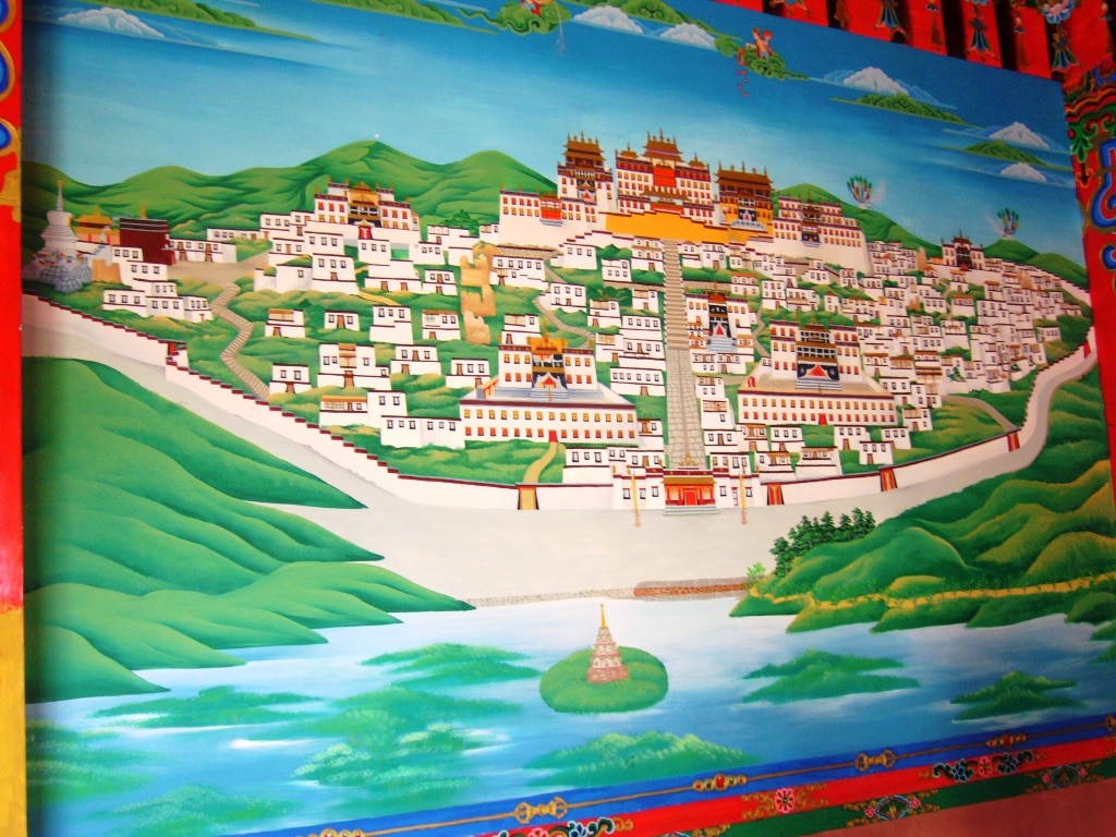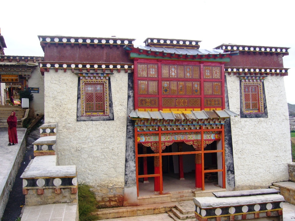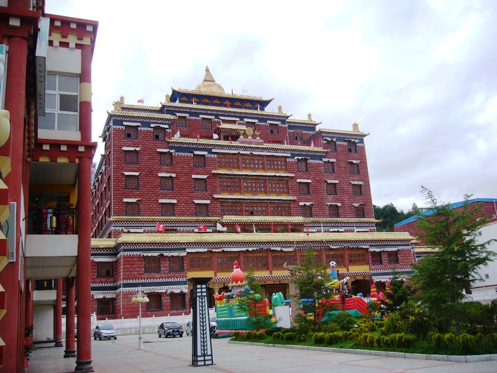 Il donne sur un petit lac et est entouré d’habitations de style tibétain.